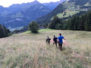 Der Drohnenpilot und 2-3 Helfer (inkl. einem Jäger) treffen sich vor Sonnenaufgang auf dem Feld. Der Landwirt hat im Vorfeld schon mal zwei – drei Holzharrassen und lange Holzstecken bereitgestellt.
